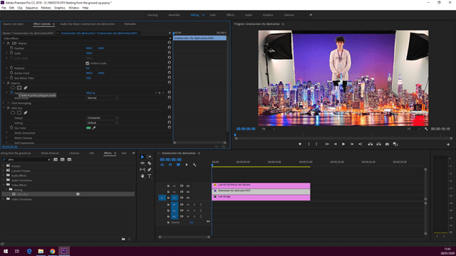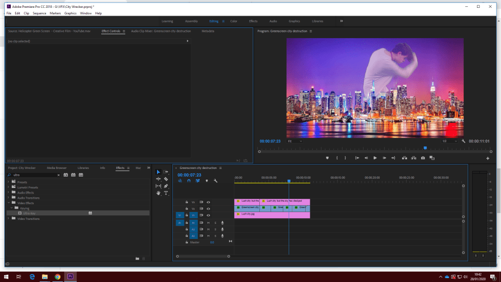 After i finished recording my footage, i opened up premier and imported it. After this i added ultra key to all the clips i cut together and selected the colour green to be pasted over. I then added my background and i was in the city
