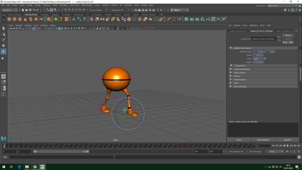 I animated my walk cycle by doing key frames. first i animated the legs to create a basic walk cycle and altered the frames in between afterwards to make it flow better and look less robotic and weird. I did this by considering the twelve principles as much as i could, making my ball bounce with his steps and raise up and down in time with them too.