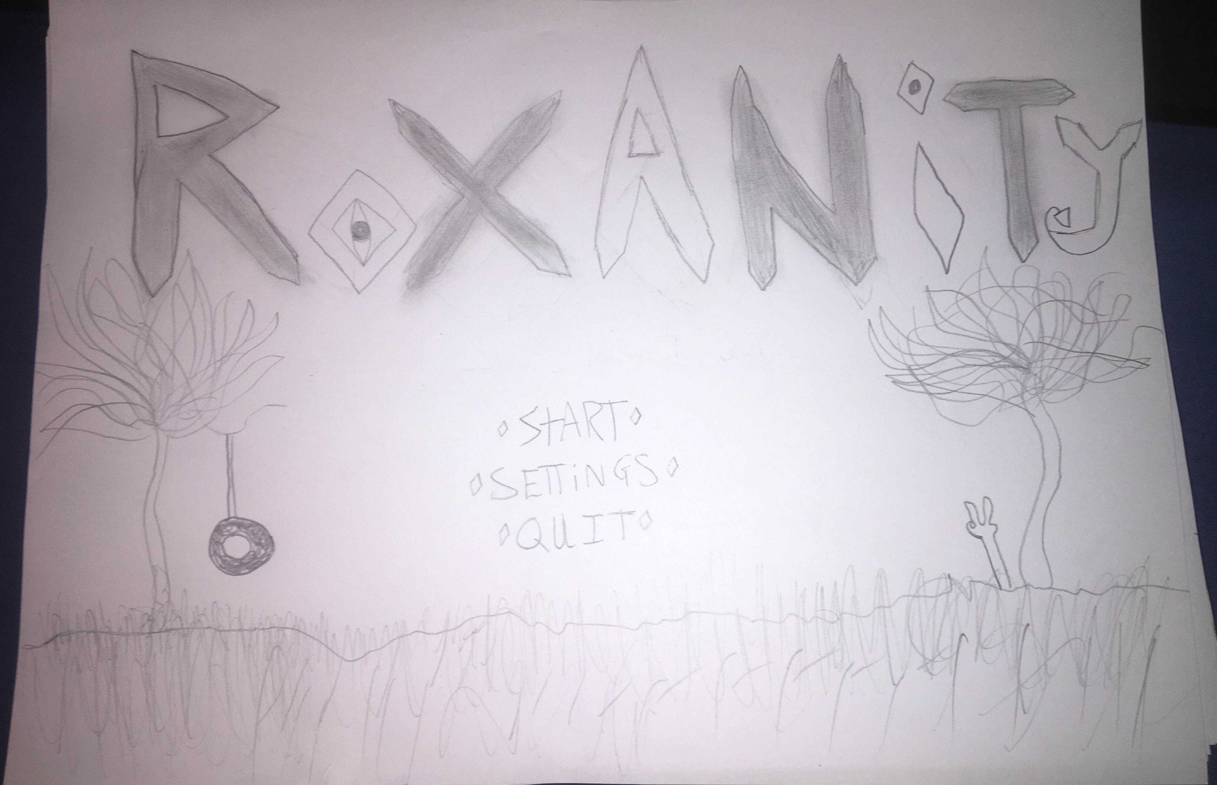 here we have a mock title screen for a game I wish to make named roxanity. If this was actually in the game it would be animated where the camera constantly pans to the right with endless dead trees passing by and other things (some examples I drew was a zombie arm doing a backwards peace sign coming from the ground and the tire swing, the title screen would have other funny/story related things passing us by. This can show the fun side of my game as early as the title screen, where as the logo and options themselves have a more cool design to make it appear at least somewhat serious.